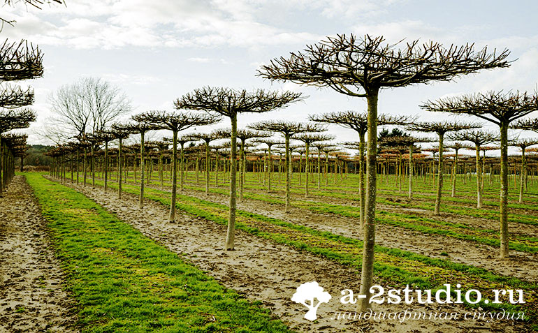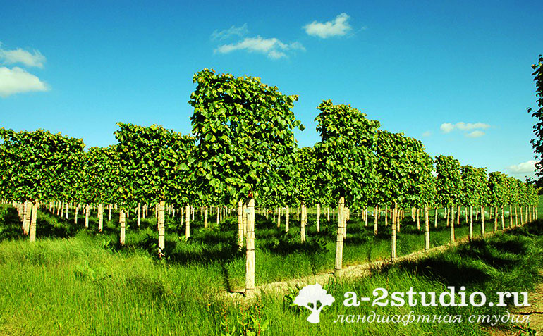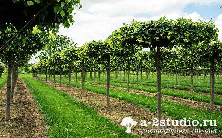 По сути, описанная выше форма кроны в виде крыши - это липа с довольно высоким штамбом, выращенная на горизонтальной шпалере.